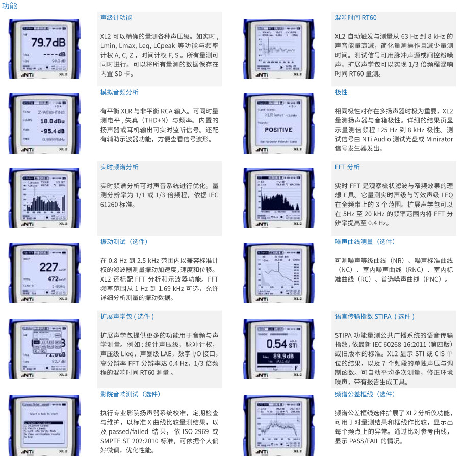 • 声学分析仪功能:测量声压级,1/3 倍频程实时频谱,快速傅利叶分析FFT,混响时间 RT60,延迟时间,极性,STIPA 语言传输指数分析