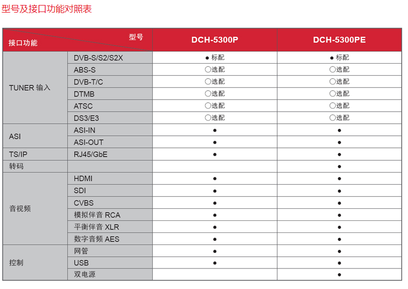 • 丰富的输入/输出接口,支持DVB-S2/C/T/DTMB/ABS-S等Tuner、DS3/E3(选项)、TS/IP和ASI输入,支持多个数字、模拟输出接口,包含HD/SD SDI、AES/EBU、HDMI、CVBS