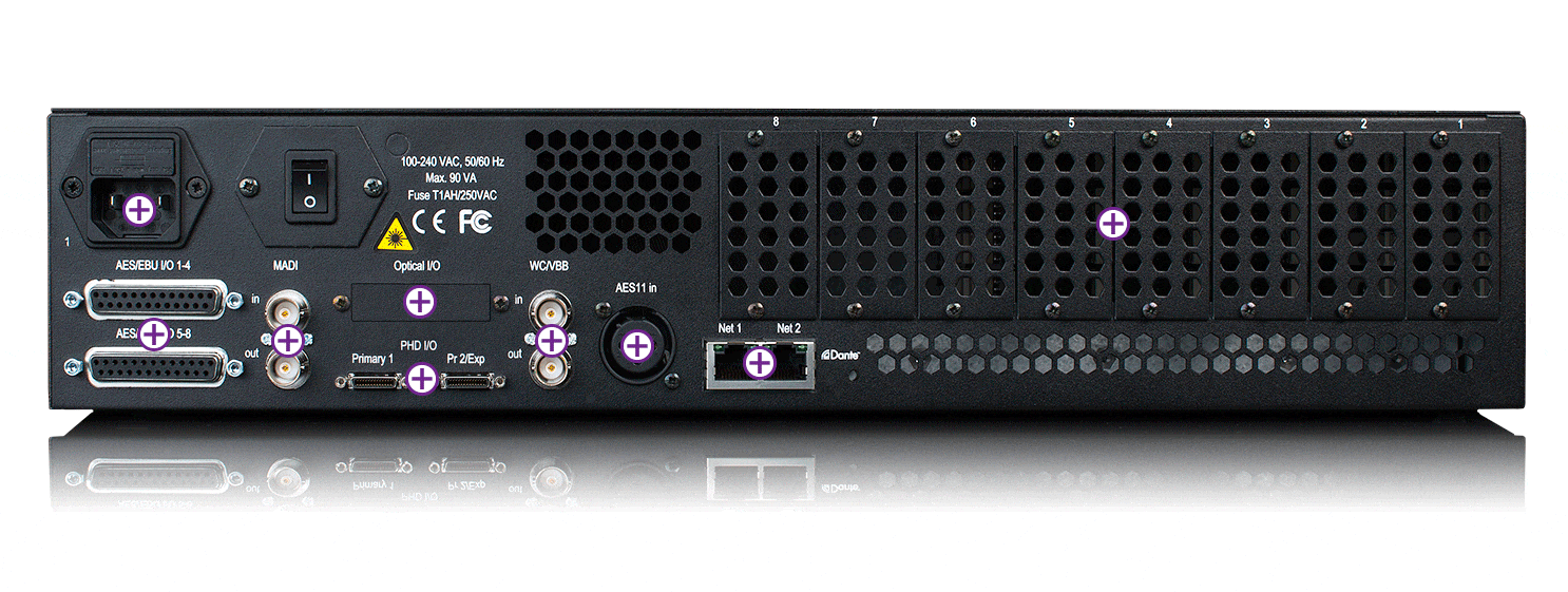 8 线性纯净 AD 卡(输入),添加 8 个线性电平模拟输入通道,方便您连接前置放大器、键盘、信号处理器、混音器和其他设备。 DigiLink I/O 卡,利用两个 DigiLink Mini 端口添加 64 个 DigiLink I/O 通道。