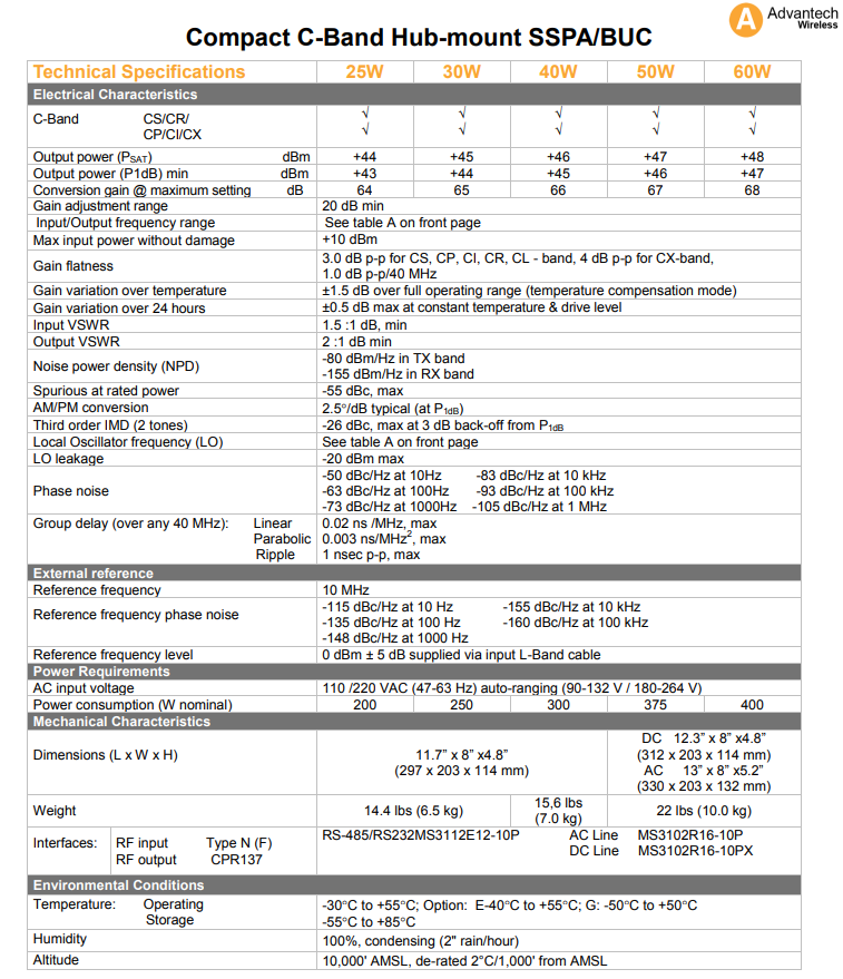 The C-Band SSPA/SSPBs, SSPB-2100C series, are hub-mount up-converter transmitters, operating in the C/X and Ku-Band. The SSPB-2100C is an integrated unit, complete with power supply, phase-locked oscillator, mixer, filter and cooling mechanism. Intended for outdoor operation, the SSPB-2100 provides the utmost in convenience and efficiency. Other SSPB‰’s are also available for higher powers or for operation at other up-link frequencies. Built-in microprocessor controller provides the capability for serial port interfaces (RS232/485) for remote monitoring and control.