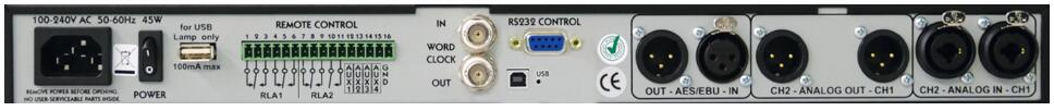 • 接口 XLR • 采样率 48kHz, 44.1kHz,Word Clock,AES/EBU, 24 bits/sample 模拟输入 • 采样率:44.1, 48kHz, 24 bit/sample • 阻抗:20 kΩ • 频响:20Hz-20kHz • 信噪比:>108dB • THD+N:<0.003% • 动态范围:>104dB • 满刻度电平:+26dBu • 串音:<-100dB @ 20 Hz to 20 kHz, - 1 dBFS 模拟输出 • 采样率:44.1, 48kHz, 24 bit/sample • 阻抗:20 kΩ • 频响:20Hz-20kHz • 信噪比:>108dB • THD+N:<0.003% • 动态范围:>108dB • 满刻度电平:+26dBu • 串音:<-100dB @ 20 Hz to 20 kHz, - 1 dBFS 物理规格 : • 尺寸(英寸) 高1.75 × 长19 × 宽12.5 • 尺寸(厘米) 高4.4 × 长48.3 × 宽26.7 • 净重 6磅 • 毛重 10磅 • 电源 50W, 输入电压范围100-240V AC 50/60Hz • 保险丝 4-Amp 250V AC (内置电源保险丝为快熔型) |
